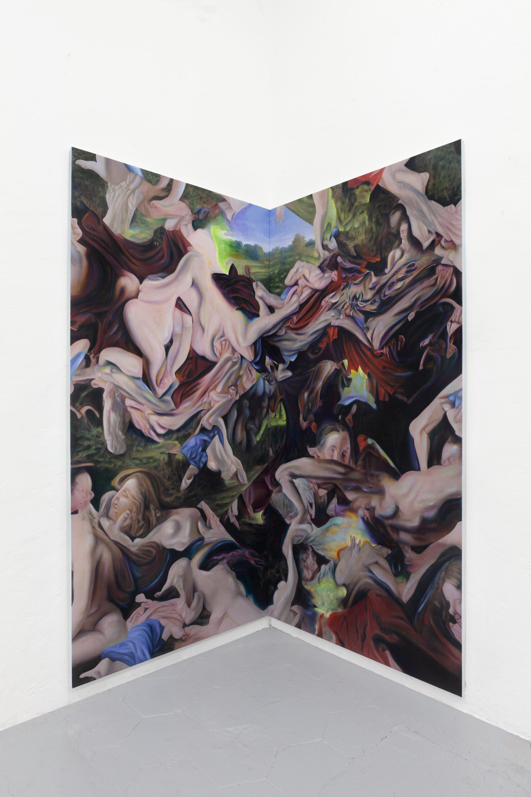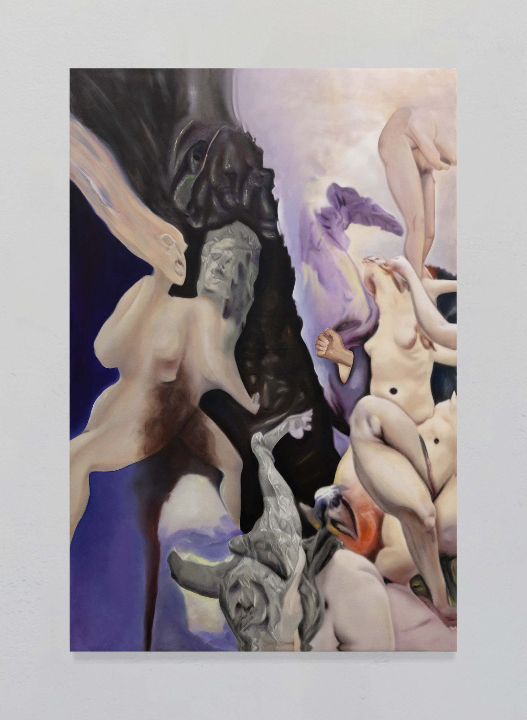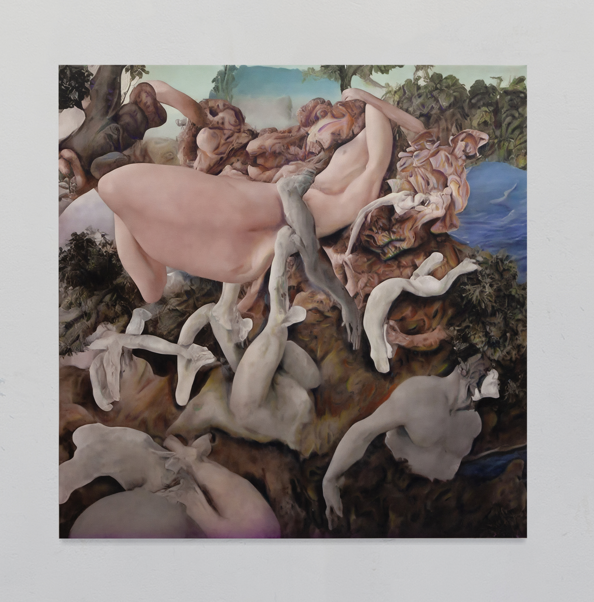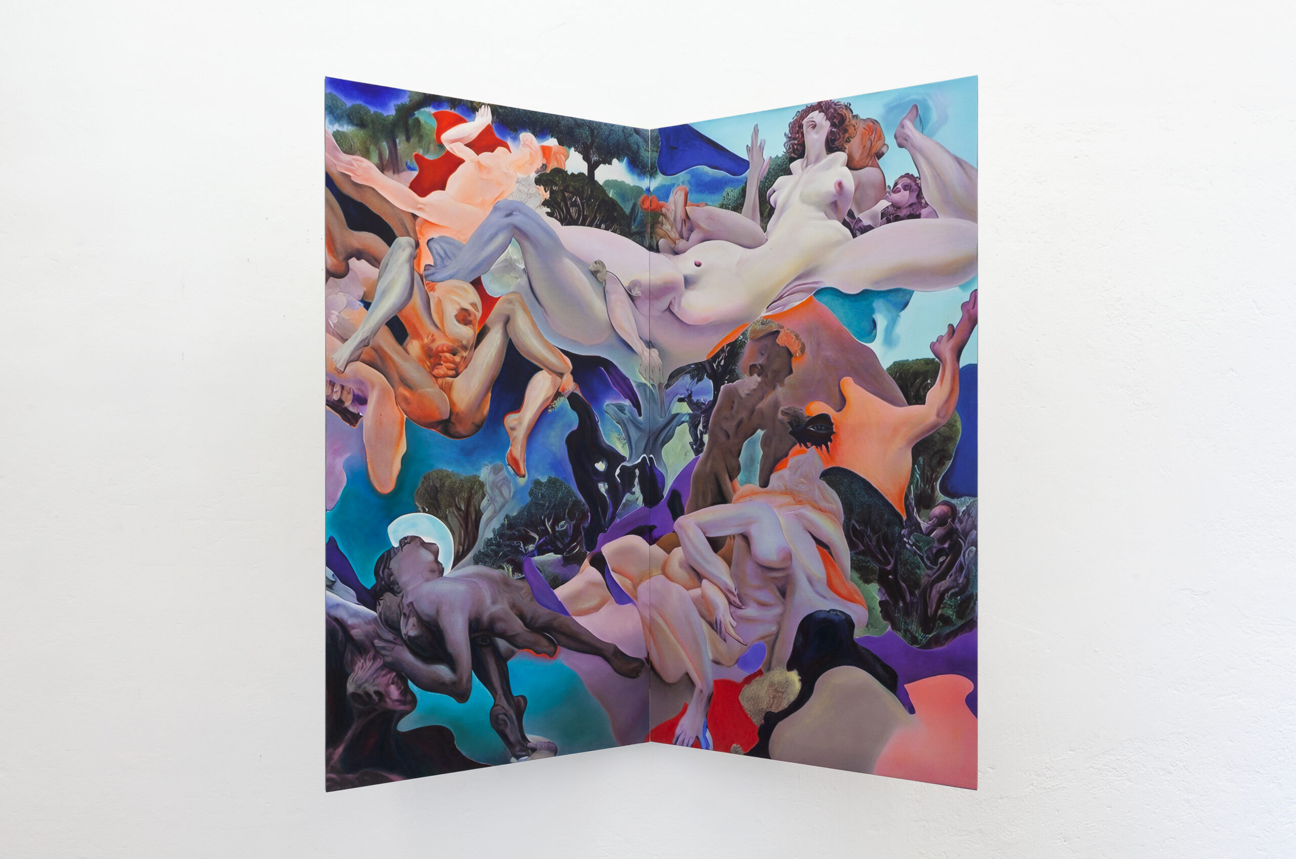 Post-Human Hallucination: merging artificial intelligence and oil painting in a repetitive and circular process to explore a new expanded ecology of visions. In Pietro Catarinella‘s work, the image is born from a hybridization: fragments of ancient works and personal paintings are introduced into artificial intelligence systems, generating mutant visions, fluid bodies, anatomies without borders. Printed on canvas, these hallucinations are then crossed by oil painting, in a gesture that does not correct but betrays, subverts, deepens. Between artificial and human, nature and artifice, Catarinella builds interior landscapes full of desire, disorientation and metamorphosis. Matter bends, memory dissolves: each work is the fragment of a post-human dream.