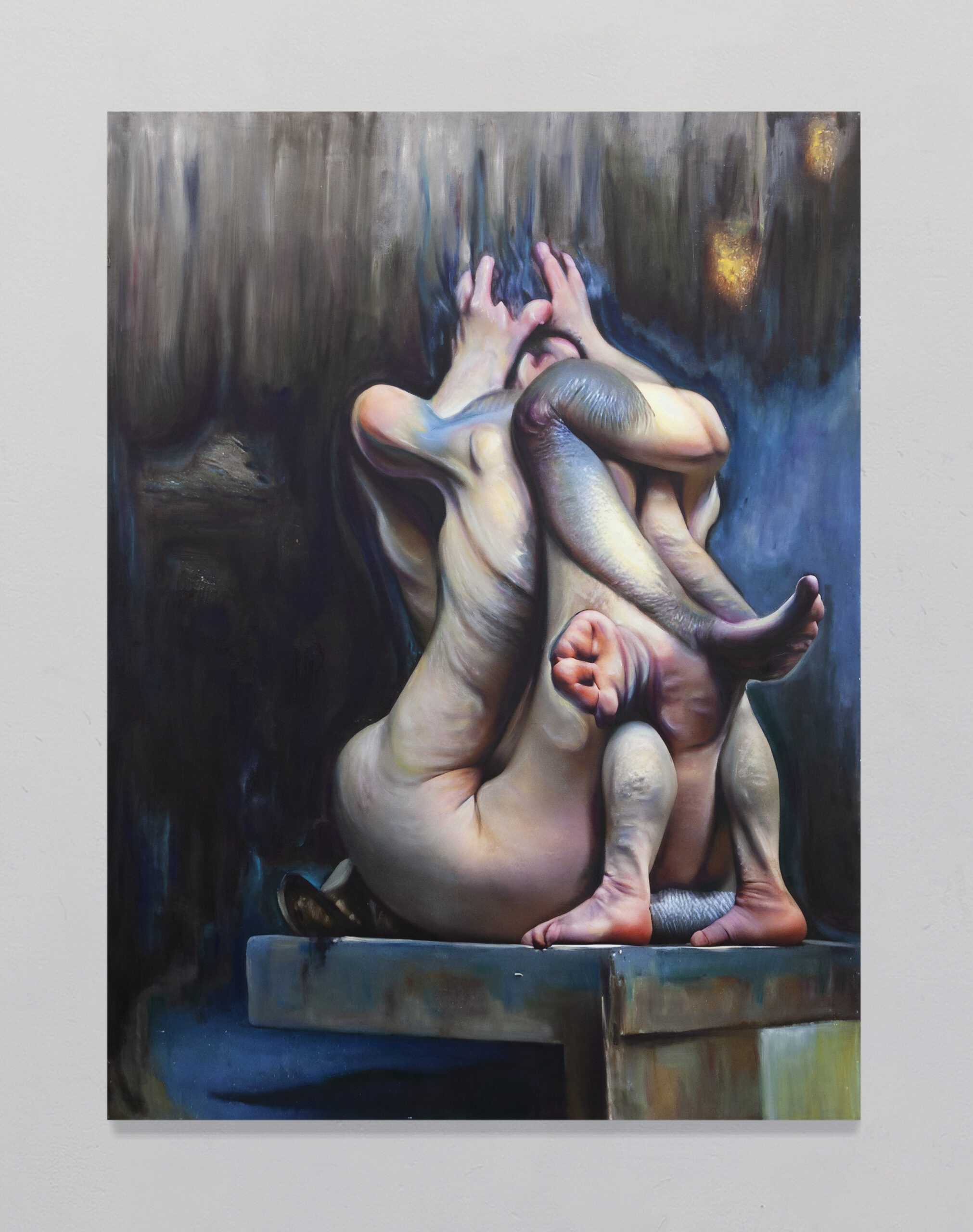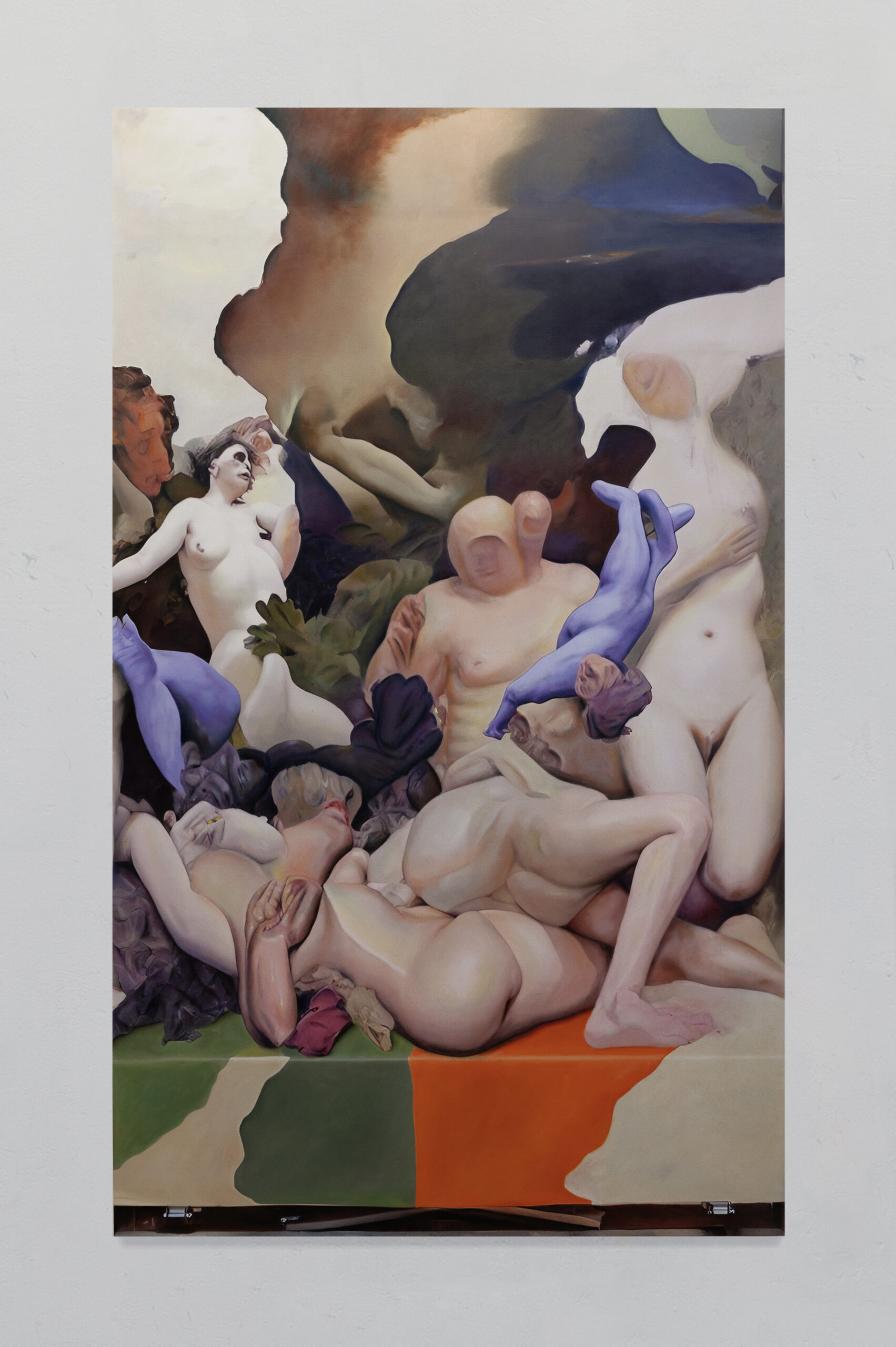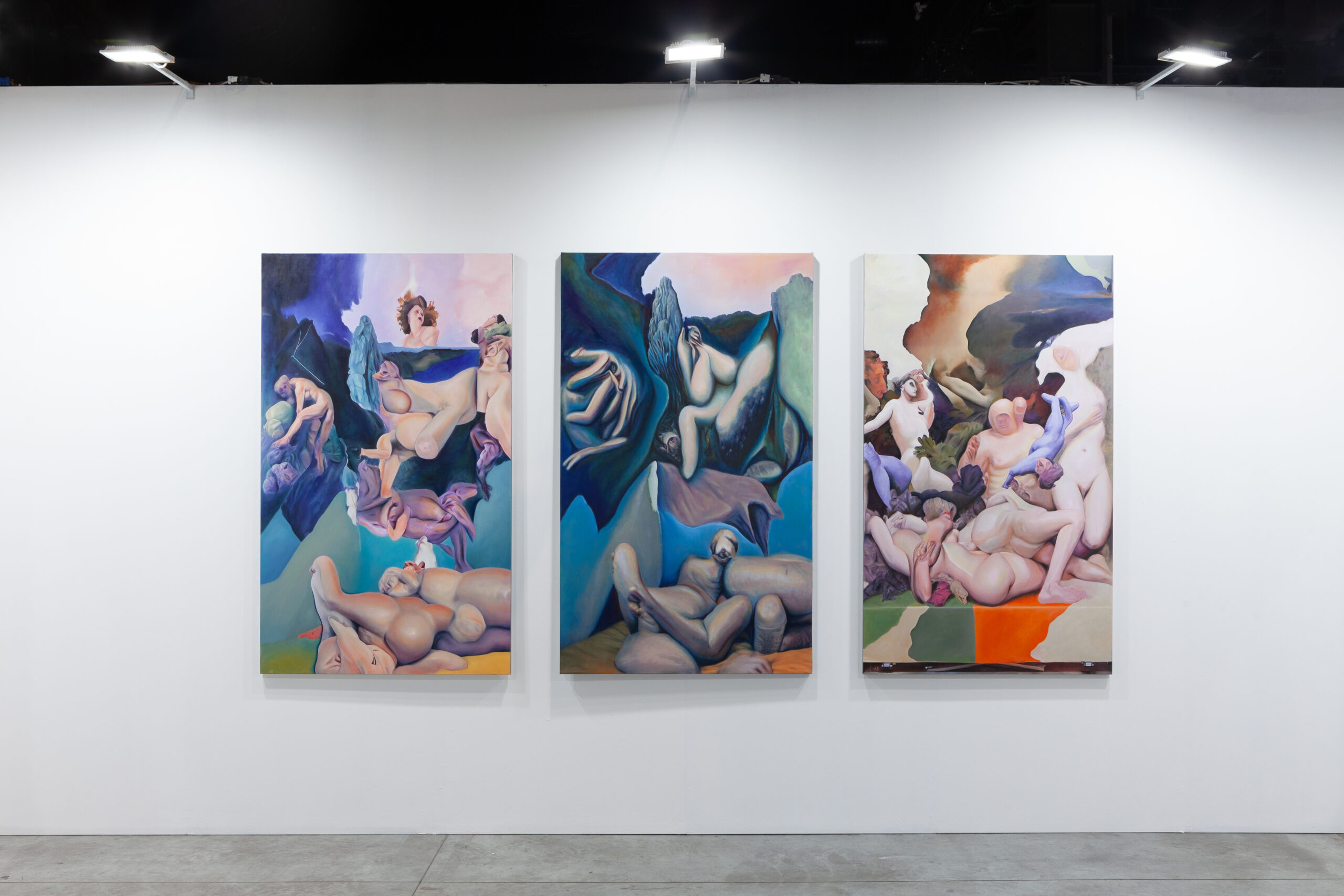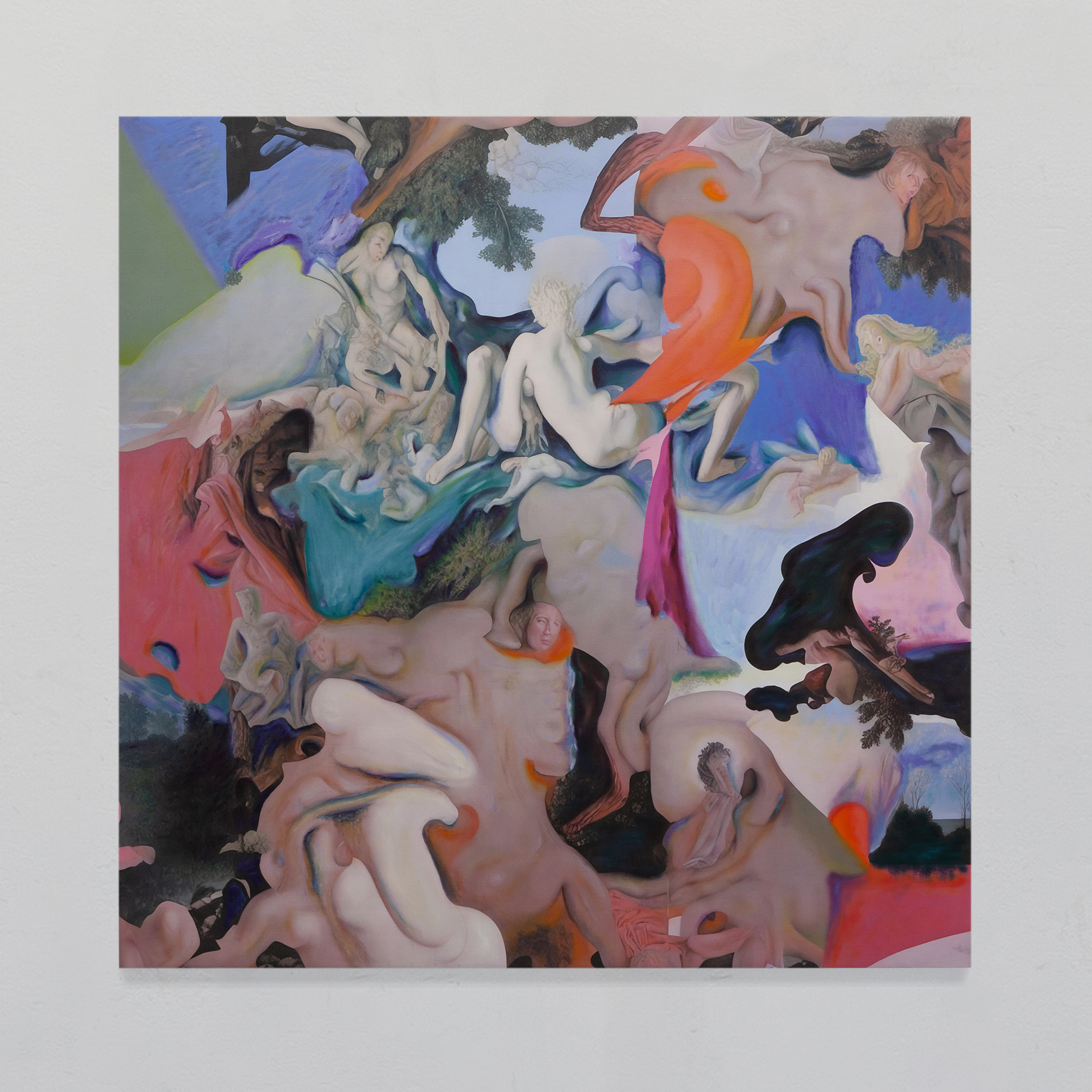 Post-Human Hallucination: merging artificial intelligence and oil painting in a repetitive and circular process to explore a new expanded ecology of visions. In Pietro Catarinella‘s work, the image is born from a hybridization: fragments of ancient works and personal paintings are introduced into artificial intelligence systems, generating mutant visions, fluid bodies, anatomies without borders. Printed on canvas, these hallucinations are then crossed by oil painting, in a gesture that does not correct but betrays, subverts, deepens. Between artificial and human, nature and artifice, Catarinella builds interior landscapes full of desire, disorientation and metamorphosis. Matter bends, memory dissolves: each work is the fragment of a post-human dream.