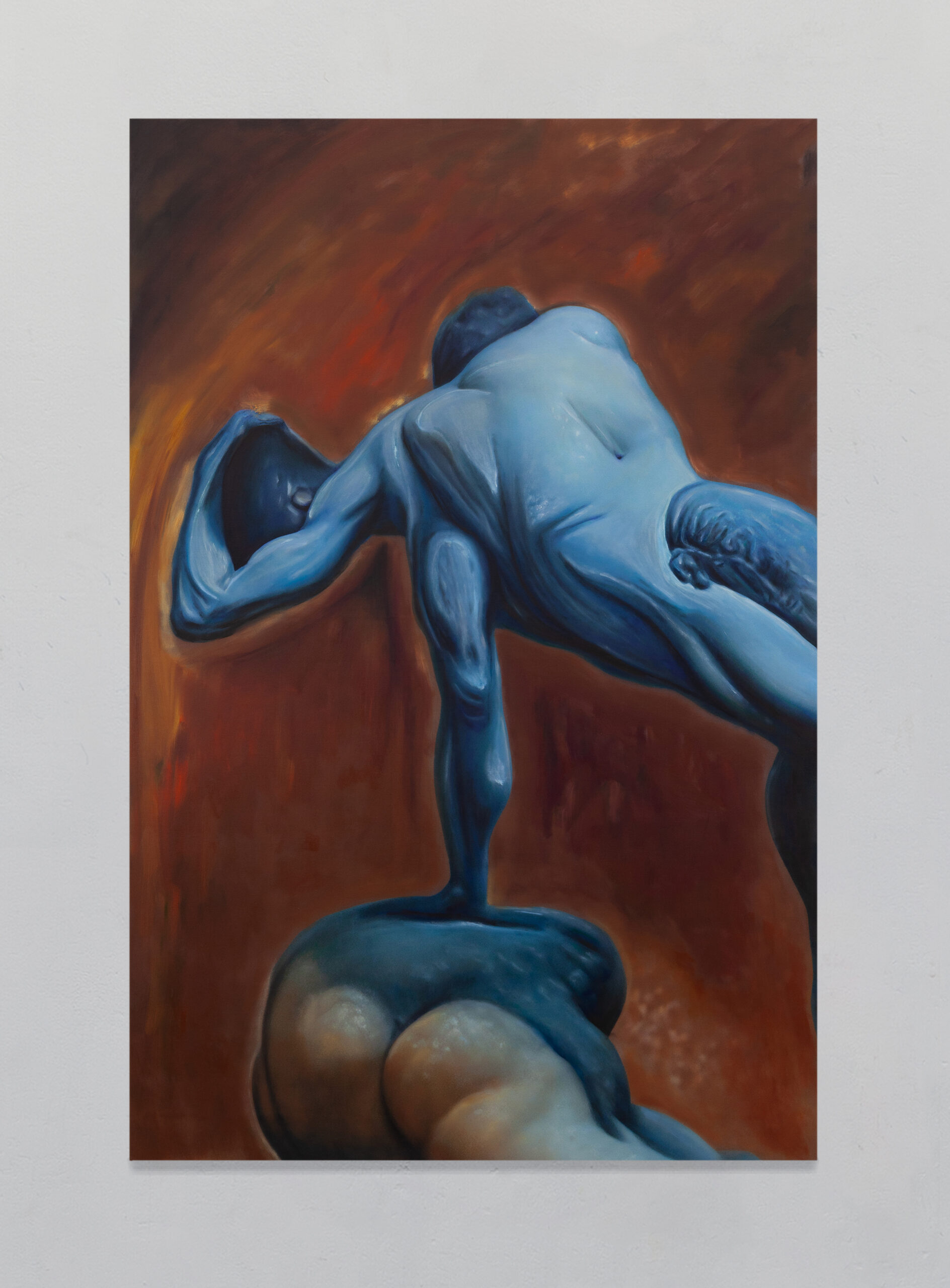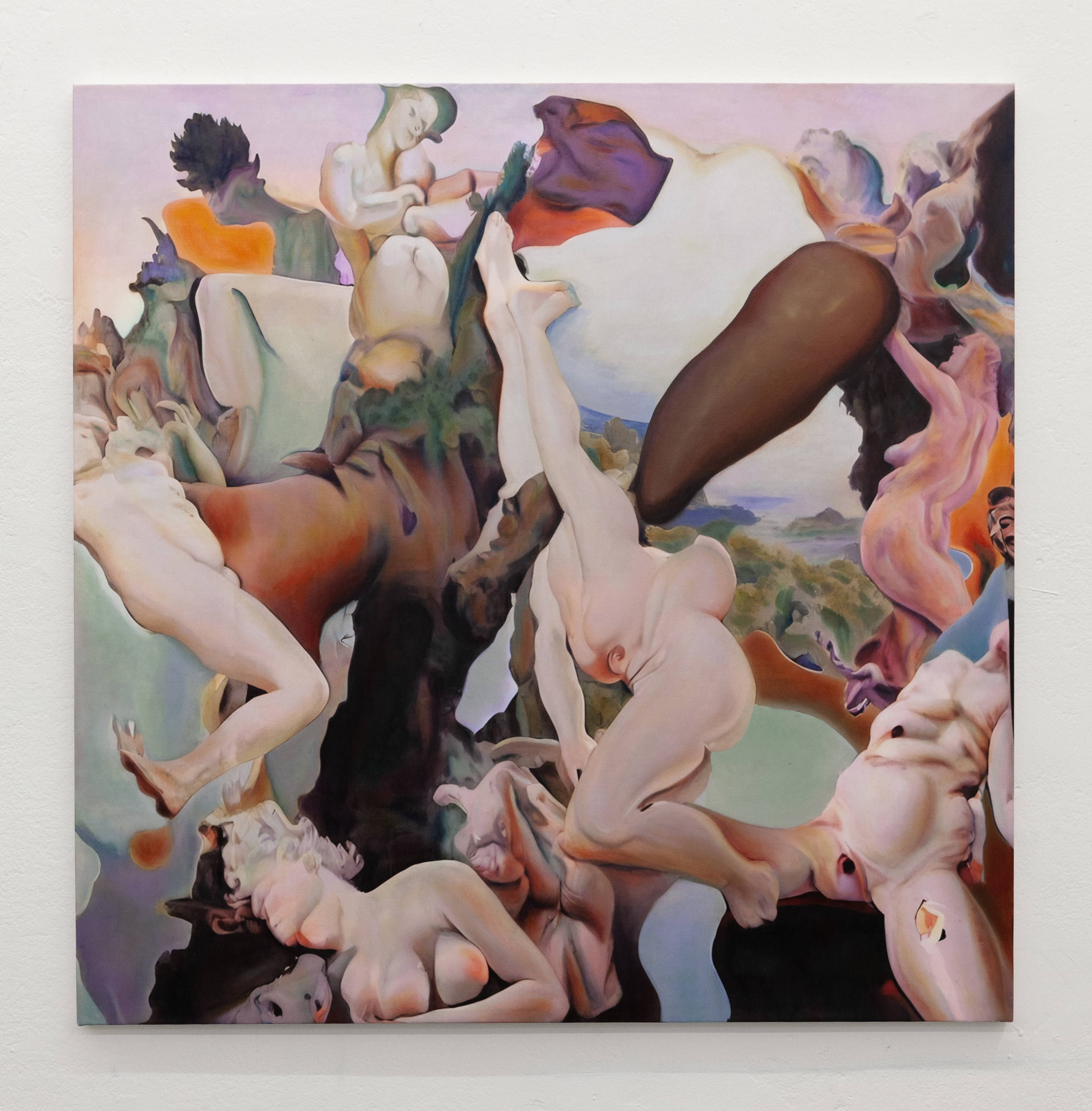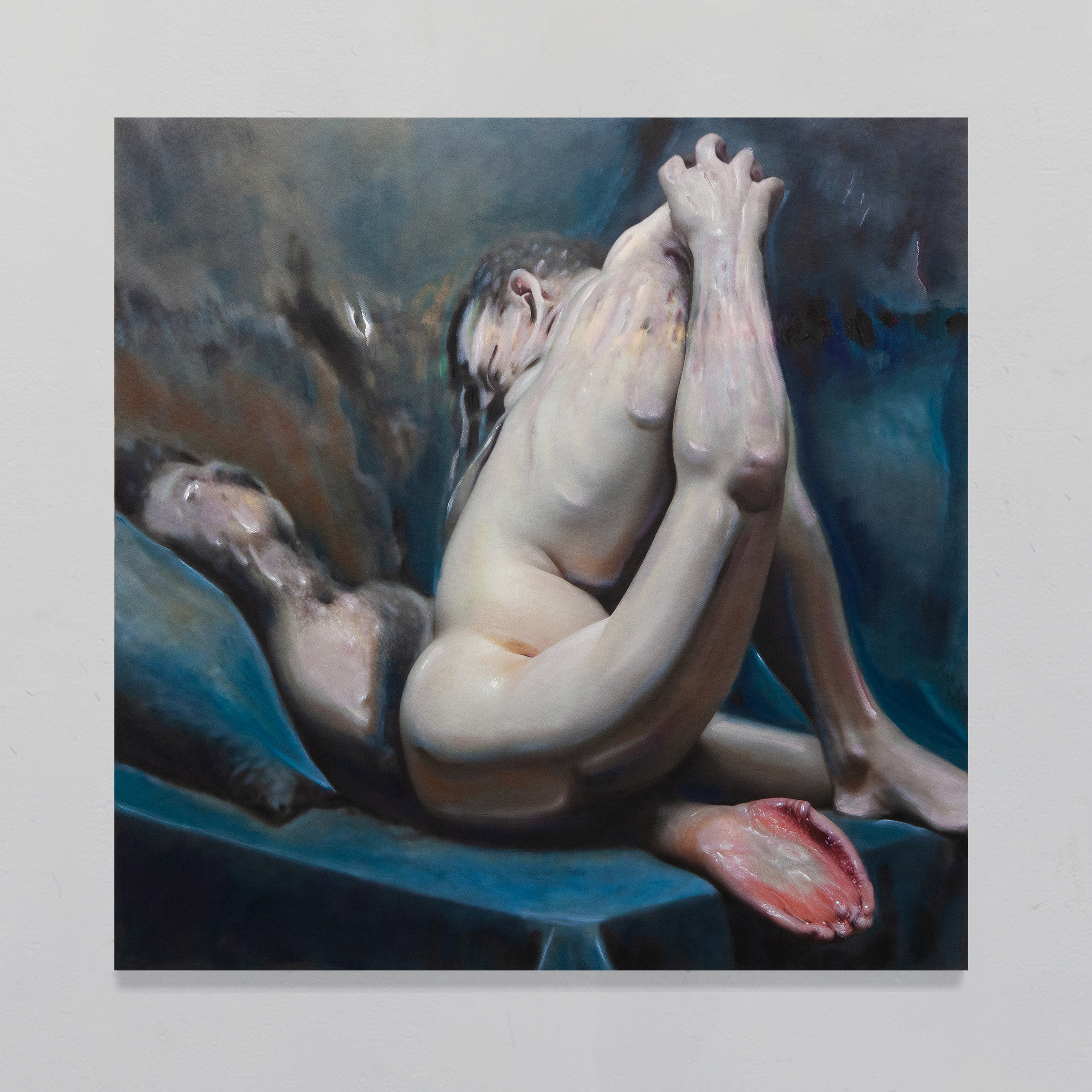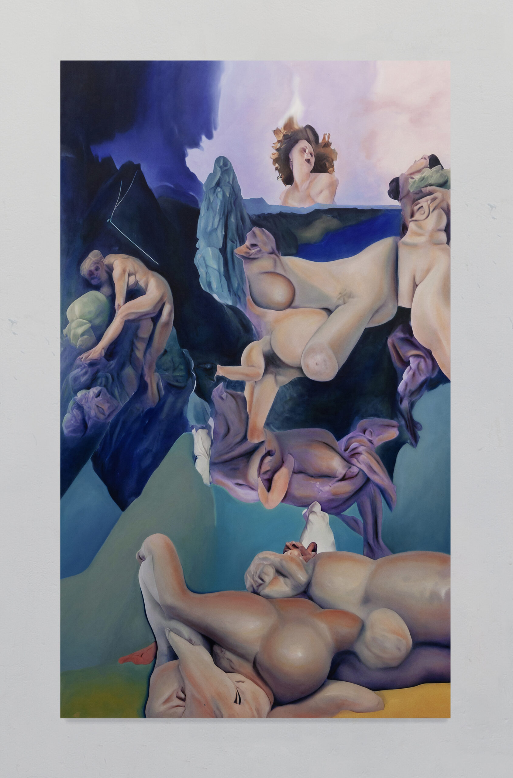 Post-Human Hallucination: merging artificial intelligence and oil painting in a repetitive and circular process to explore a new expanded ecology of visions. In Pietro Catarinella‘s work, the image is born from a hybridization: fragments of ancient works and personal paintings are introduced into artificial intelligence systems, generating mutant visions, fluid bodies, anatomies without borders. Printed on canvas, these hallucinations are then crossed by oil painting, in a gesture that does not correct but betrays, subverts, deepens. Between artificial and human, nature and artifice, Catarinella builds interior landscapes full of desire, disorientation and metamorphosis. Matter bends, memory dissolves: each work is the fragment of a post-human dream.