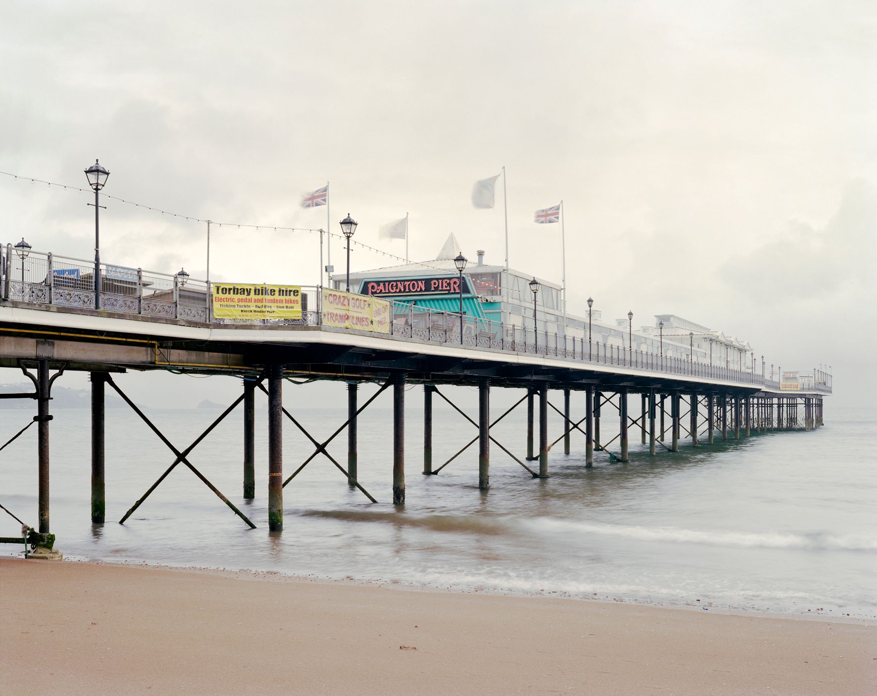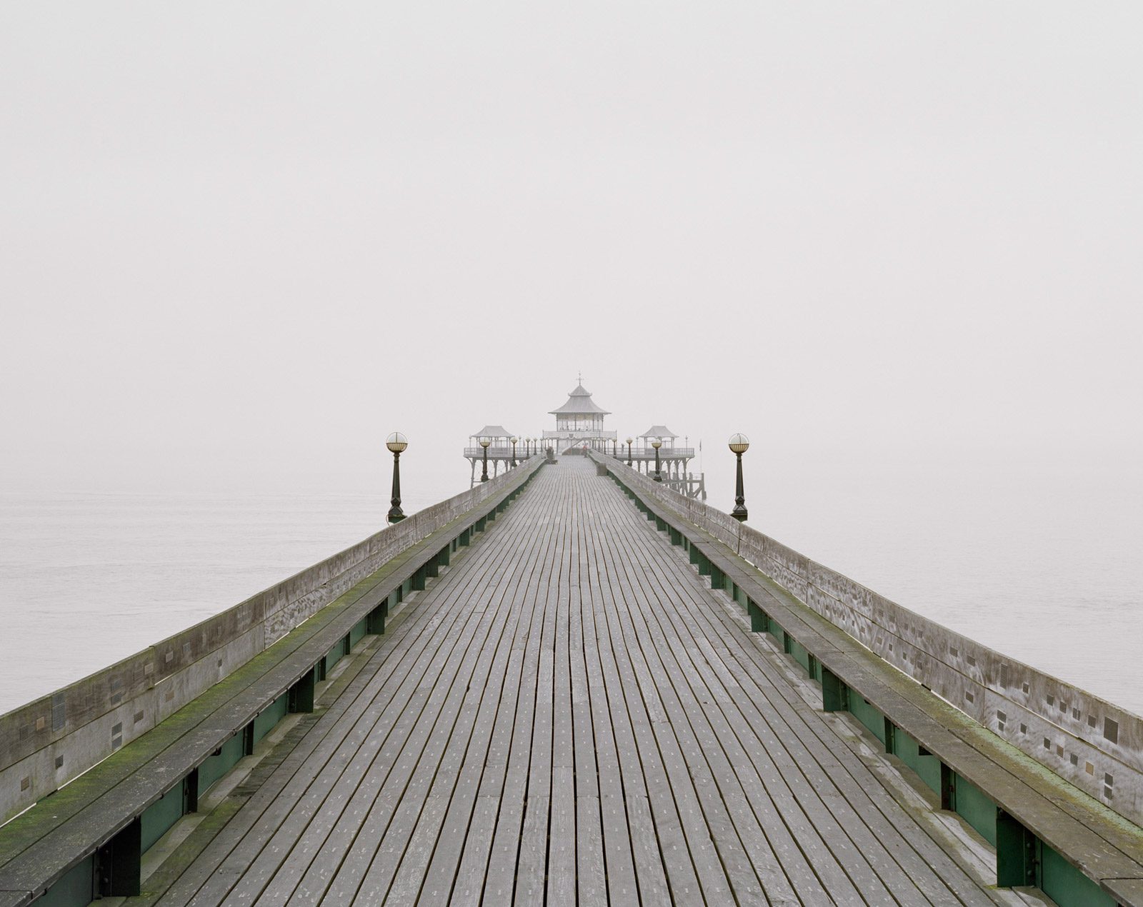 With Pierdom, Simon Roberts turns his camera to a specific architectural remnant that bears witness to leisure of the past—not just in England, but around Britain. Mostly built in the 19th Century along the coastline of Britain, these piers were originally constructed as landing docks for pleasure steamers, but progressively catered to the needs of seaside day-trippers, who were escaping the grime and smog of the cities. In their heyday, the ‘pleasure piers’ incorporated cafes, casinos, theaters and even tramways. While some were modest structures others were elegant and exotic, thrusting out into the sea with characterstic Victorian aplomb. At the turn of the last century, almost a hundred piers existed: now only half remain and several face an uncertain future. All have interesting tales to tell, usually involving fierce weather, boat strikes, fires and the practice of ‘sectioning’ in the Second World War, when many piers on the east and south coasts were partly dismantled to prevent them being used as landing stages by the Germans. Following in the footsteps of Francis Frith, whose company made the last major photographic survey of these peculiarly British structures in the early 20th century, Roberts has been documenting the remaining piers, mostly out-of-season, using his signature landscape style and traditional 4 x 5” plate camera. The photographs echo his work in We English: topographical landscapes, sometimes figurative and with a minimal colour palette. Over the next year Roberts will be photographing every surviving Pleasure Pier in the country as identified by the National Pier Society. A monograph of the work will be published in 2013.